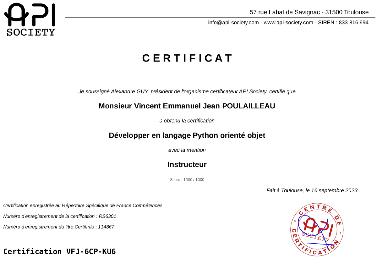 Certification API Society J’ai eu une note de 1000/1000 à une certification Python. Pour tout dire, mon objectif était d’avoir le niveau « Instructeur », ce qui m’autorise à animer des formations préparant à cette certification. Je parle de https://api-society.com/fr/certifications/technologies-numeriques/developpement-logiciel/fondamentaux-python, certification reconnue par l’état (France Compétences : https://www.francecompetences.fr/recherche/rs/6301/). Les objectifs sont d’attester que vous maîtrisez les bases de Python (types de données basiques, if et boucles, fonctions, modules, paquets, programmation orientée objet, et un peu de la bibliothèque standard).
