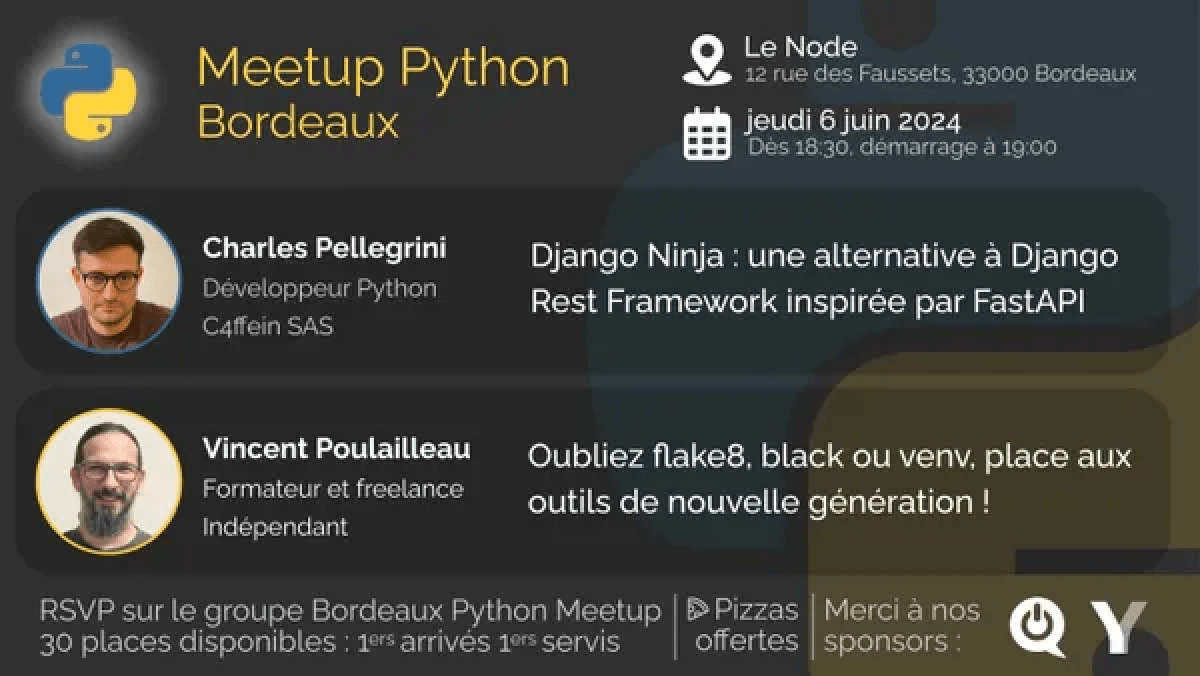 Meetup Python Bordeaux Après quelques années d’absence, le meetup Python Bordeaux reprend vie : https://www.meetup.com/py-bdx/events/300614701/. Pour cette reprise, je me suis proposé pour faire un talk nommé : Oubliez flake8, black ou venv, place aux outils de nouvelle génération ! Le tout devant une cinquantaine de personnes passionnées de Python. J’y montre l’utilité des environnements virtuels, des linters et formateurs de code. Et je présente de nouveaux outils faits par https://astral.