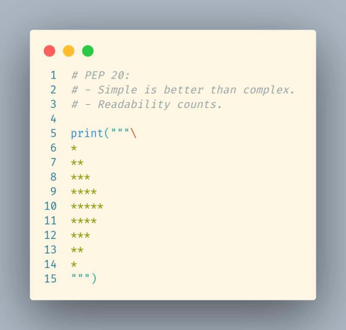 Introduction Je vois passer un post sur LinkedIn qui dit : faites le code le plus simple pour afficher : * ** *** **** ***** **** *** ** * Spoiler : ma solution est à la fin et aussi en image. Parmi les réponses que les lecteurs ont fournies (oui, elles ont réellement été proposées), en voici quelques-unes. Solution intuitive pour les débutants 1 2 3 4 for i in range(6): print('*' * i) for i in range(4, 0, -1): print('*' * i) Autre solution moins intuitive, mais compréhensible par les débutants 1 2 3 4 5 for i in range(10): if i <= 5: print('*' * i) else: print('*' * (10 - i)) Solution de la personne payée au nombre de caractères 1 2 3 4 5 6 7 8 9 10 11 12 13 14 15 16 17 18 19 20 21 def print_row(n): print("* " * n) def print_top_half(n): for row in range(1, n + 1): print_row(row) def print_bottom_half(n): for row in range(n - 1, 0, -1): print_row(row) def print_triangle(n): print_top_half(n) print_bottom_half(n) triangle_height = 5 print_triangle(triangle_height) Solution sans if 1 2 3 4 5 6 def pyramid(height): for num in range(1, 2 * height + 1): print('*' * min(num, 2 * height - num)) pyramid(5) Solution logique, mais difficile à lire au premier coup d’œil 1 print(*(("* " * x) for x in range(1, 5)), *(("* " * x) for x in range(5, 0, -1)), sep='\n') Solution rusée, mais difficile à lire au premier coup d’œil 1 2 3 from itertools import chain print(*(("* " * x) for x in chain(range(1, 5), range(5, 0, -1))), sep='\n') Un peu dans la même idée 1 2 3 4 5 6 7 8 def print_pattern(): counts = list(range(1,6)) # [1, 2, 3, 4, 5] counts += list(range(4,0,-1)) # [1, 2, 3, 4, 5] + [4, 3, 2, 1] strs = list(map(lambda c: print("*" * c), counts)) print("\n".